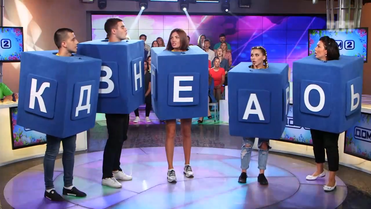Команды должны выстраивать ответы на вопросы ведущего из кубиков, которые на них надеты. "Яички" справились с заданием за 2 минуты 42 секунды, а "На донышке" - за 2 минуты 30 секунд. #дом2 #клубдураков #конкурс