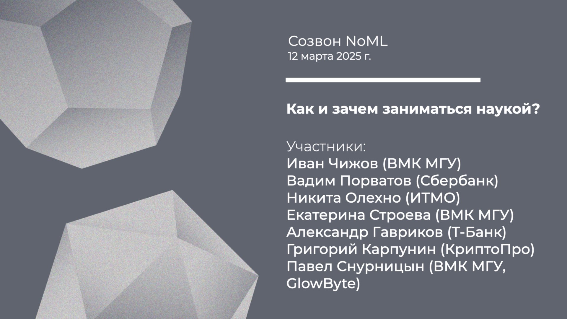 Вопросы и комментарии — в Telegram-чате сообщества NoML: t.me/noml_community Материалы всех мероприятий — в базе знаний: noml.club Анонсы новых мероприятий и другая полезная информация — в канале сообщества NoML: t.me/noml_digest