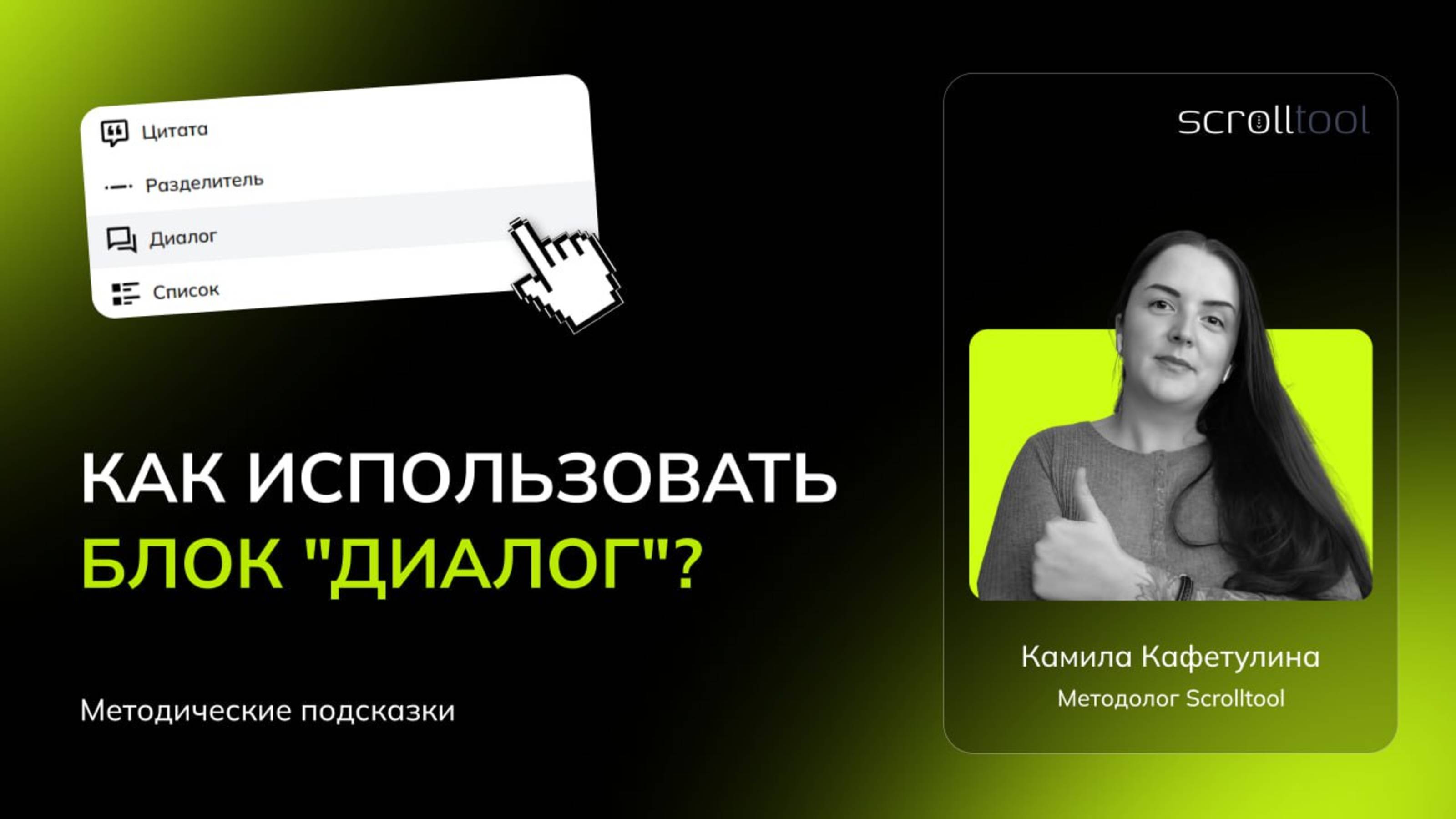 Методические подсказки Scrolltool - рубрика для тех, кто создаёт корпоративное онлайн-обучение. В этом выпуске - всё о блоке «Диалог»: где он работает лучше всего, как сделать его естественным и вовлекающим, какие нюансы учесть и другие лайфхаки от методолога Scrolltool Камилы. Посмотрите, как блок «Диалог» помогает сделать обучение интересным и эффективным.