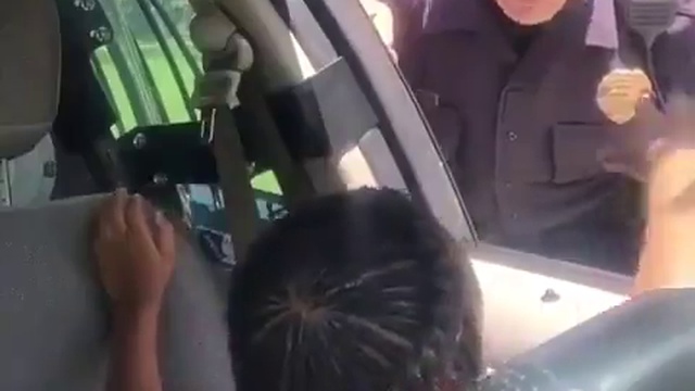 Девочка забралась в автомобиль и просит деньги у полицейского.
