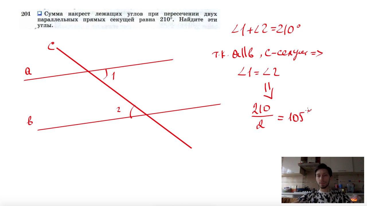№201. Сумма накрест лежащих углов при пересечении двух параллельных прямых секущей равна 210°. Найдите эти углы. Поддержать канал рублём - 5469400944002125 (Сбербанк) Мой второй канал для подготовки к ЕГЭ и ОГЭ - https://www.youtube.com/ЕвгенийСумин Инстаграм - https://www.instagram.com/EGE_OGE.math Личный инстаграм - https://www.instagram.com/ee_sumin VK - https://vk.com/evgeniysumin FB - https://www.facebook.com/EvgeniySumin