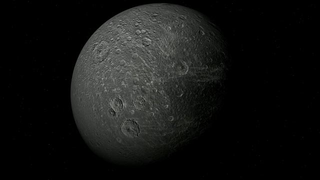 700 miles in diameter, Dione is a mid-sized moon of Saturn. Mostly made from water ice, it has a 'dirty' surface and probably a small rocky core. Music: Mountain Dub by Gunnar Olsen