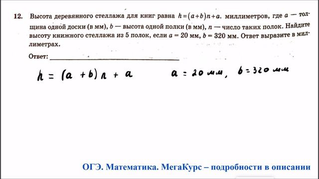 Задание 12. Высота деревянного стеллажа для книг равна ..., где а - толщина одной доски (в мм), b - высота одной полки (в мм), n - число таких полок. Найдите высоту книжного стеллажа из 5 полок, если а = 20 мм, b = 320 мм. Ответ выразите в миллиметрах. Тема задания - работа с формулами Группа ВК для подготовки к ОГЭ: https://vk.com/secretroom2023 Видеокурс для подготовки к ОГЭ по математике: https://stepik.org/a/193288