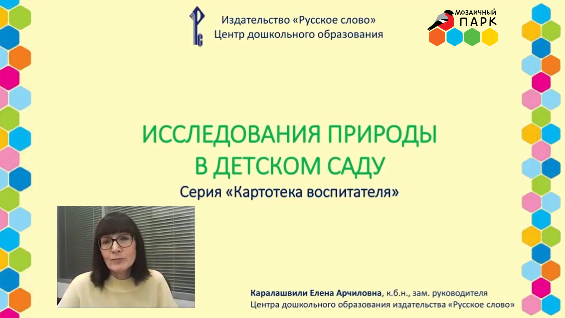 Ведущий вебинара: Елена Арчиловна Каралашвили, кандидат биологических наук, доцент, заместитель руководителя ЦДО издательства «Русское слово», автор книг и пособий. Содержание вебинара: Елена Арчиловна Каралашвили представит картотеку «Исследование природы в детском саду» из серии «Картотека воспитателя». Автор картотеки Рыжова Наталья Александровна, доктор педагогических наук, лауреат Премии Правительства РФ в области образования, лауреат Премии Правительства Москвы в области охраны окружающей среды. На вебинаре будет представлено содержание двух частей картотеки: как организовать экспериментальную лабораторию в группе детского сада, как организовать исследовательскую деятельность с дошкольниками. Будут рассмотрены варианты интересных опытов и наблюдений. Вы познакомитесь с опытом пилотных площадок по организации экспериментирования в природе и в условиях группы детского сада. Присоединяйтесь к нам в социальных сетях! Центр дошкольного образования: https://мозаика-парк.рф/ Вконтакте https://vk.com/mozaika_park Издательство «Русское слово»: https://русское-слово.рф/ ВКонтакте: https://vk.com/rus_slo Одноклассники: https://ok.ru/group/57720246435859 Телеграм: https://t.me/rslovo #Русское_слово #Вебинары_РС #дошкольники #МозаичныйПАРК #детскийсад #помощьвоспитателю