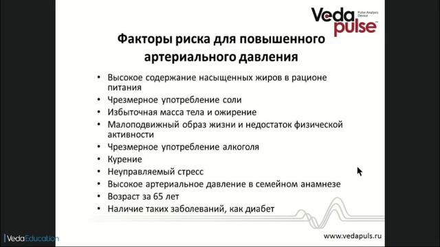В этом видео: - Артериальное давление – барометр здоровья; - Механизмы регуляции артериального давления; - Почему повышается артериальное давление; - Основные проявления и осложнения артериальной гипертензии; - Профилактика артериальной гипертензии (диета, образ жизни); - Индексы « ВедаПульс» при артериальной гипертензии. Эксперт: Арчибасова Елена Алексеевна, к.м.н., врач, доцент кафедры нормальной физиологии НГМУ
