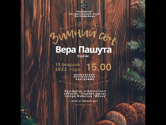 13 февраля 2022 года в выставочном зале Культурно-исторического комплекса «Золотое кольцо города Витебска «Двина» народный литературный клуб «ЛитКофейник» представил музыкально-поэтическую программу нашей гостьи из п. Ушачи, члена народного клуба творческих встреч «Муза», финалиста «Витебского листопада – 2021», лауреата и дипломанта Международных творческих конкурсов Веры Пашуты. «Зимний сон» – так назвала Вера свой творческий вечер.