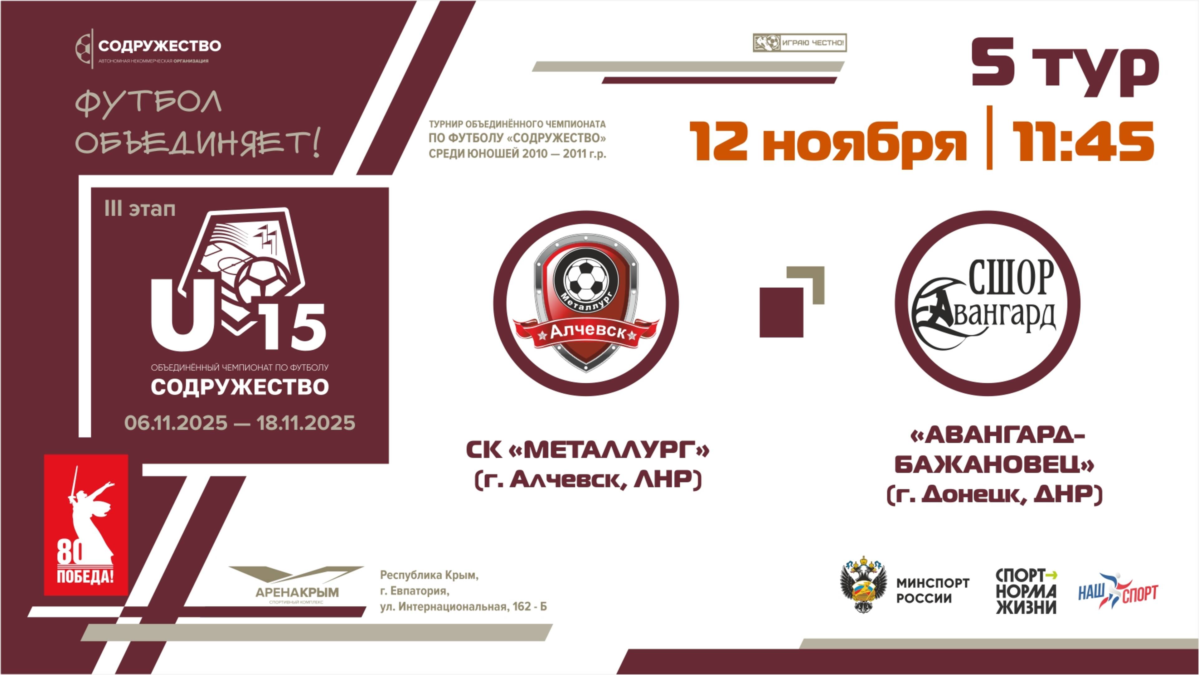 5 ТУР | U-15 | СК "Металлург" (Алчевск, ЛНР) - "Авангард-Бажановец" (г. Донецк, ДНР) | 12.11.2025