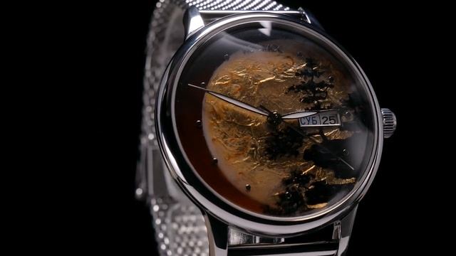 Суперлунием называют момент, когда полная Луна подходит к Земле на расстояние ближе 362 тысяч километров. Диск при этом светится ярче на треть, диаметр спутника выглядит больше на 15%. Это, несомненно, эффектное астрономическое явление отражено в сюжете лаковой миниатюры на циферблате часов Космос. На основу наносится тончайший лист фольги, следом - несколько слоев лака и краски. Их чередование создает эффект объема и ощущение динамики. Постепенно прорисовываются детали: на один сюжет требуется до 50 часов работы. Процесс запекания миниатюры в специальной печи придает рисунку необходимый блеск и завершенность. Часы созданы в единственном экземпляре. В часах установлен механизм TMI с функцией автоподзавода. Кроме часов, минут и секунд здесь предусмотрены дата и день недели. Их индикатор, выделенный накладной рамкой, вы найдете в позиции «3 часа». За движением деталей механизма можно наблюдать, стоит только перевернуть часы: задняя крышка прозрачна. Часовая и минутная стрелка покрыты люминесцентным составом, который светится в темноте. Минеральное стекло сделано по технологии, характерной для 60-70-х годов прошлого века: оно выпуклое с обеих сторон. Нити из нержавеющей стали в браслете складываются в особое плетение, названное «миланским». Оно придает браслету гибкости, сохраняя прочность. Специальная застежка позволяет легко регулировать длину браслета самостоятельно. https://cosmos-watches.ru/catalog/unikalnye-chasy/17500/