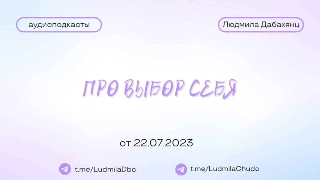 Аудиоподкаст от 22.07.23 На тему «Про выбор себя» ТЫ МОЖЕШЬ ПРИЙТИ СО СВОИМ ЗАПРОСОМ! ✓ Обязательно поставь лайк ✓ Подпишись на канал ✓ И поделись с близкими Это будет вашим балансом за движение и получение энергии. Если есть желание создать баланс брать-давать... приму от всего сердца с благословением (донейшн). С Огромной Любовью, Дабахянц Людмила ✨ Telegram: https://t.me/ludmiladbc ✨ Канал в telegram “Я ЕСТЬ ТО, ЧТО Я ЕСТЬ”: https://t.me/LudmilaChudo ✨Онлайн-школа: https://ludmilachudo.skillspace.ru/school