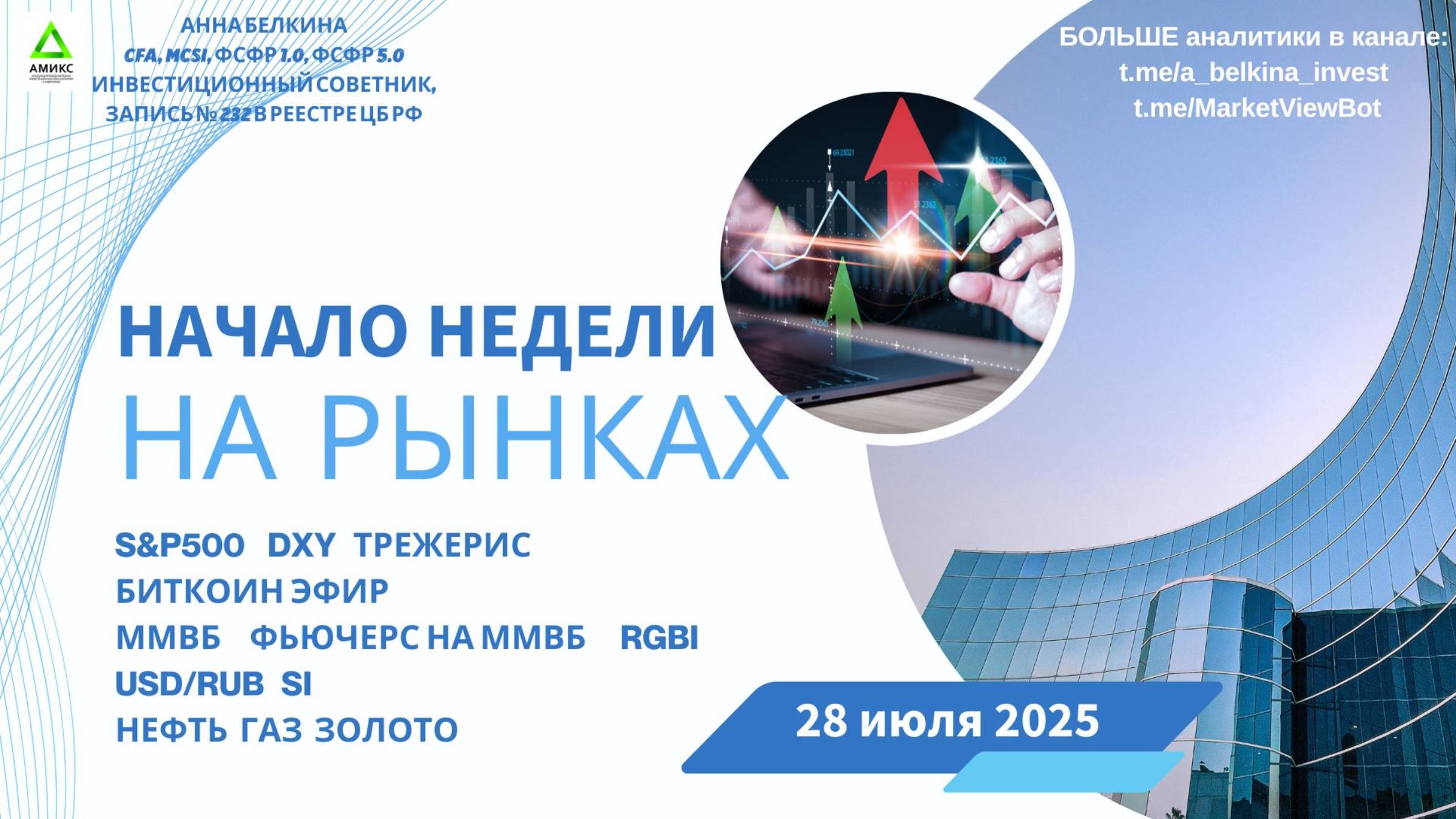 В Обзорном видео посмотрим на американский рынок #SP500, индекс доллара #DXY и доходности на 10-летние Трежерис #US10Y. Посмотрим на изменения на российском фондовом рынке – индекс RGBI, индекс ММВБ #IRUS, фьючерс на индекс ММВБ - #MICEX; валютные пары #USDRUB, фьючерс на доллар-рубль #Si. Посмотрим на сырьевые товары – нефть #Brent, газ #Gas, золото #Gold Движение на крипте через Биткоин #BTC, #ETH. Больше разметок в открытом ТГ канале: t.me/a_belkina_invest Подписка на Закрытый канал: https://t.me/MarketViewBot Сайт: https://a-belkina-invest.ru/ Сертификаты: CFA и MCSI (от британского института CISI); ФСФР 1.0 и ФСФР 5.0. Инвестиционный Советник, запись № 232 в реестре ЦБ РФ. Контент имеет информативный характер и не является инвестиционной рекомендацией.