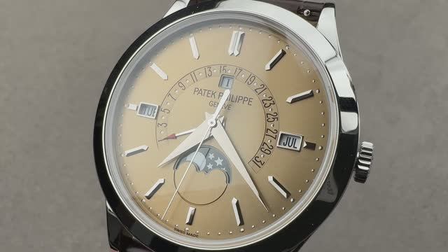 *перевести видео можно в Яндекс браузере Часы Patek Philippe Grand Complications Perpetual Calendar (5496P-014) имеют платиновый корпус диаметром 39,5 мм, обрамляющий циферблат медово-коричневого цвета на коричневом ремешке из кожи аллигатора с платиновой застежкой Calatrava Cross. Функции включают в себя отображение часов, минут, секунд, дня недели, ретроградной даты, месяца, вечного календаря и фазы Луны. Толщина часов также составляет 11,3 мм, а расстояние от выступа до выступа составляет 47,8 мм. Для получения более подробной информации ознакомьтесь с полным обзором вечного календаря Patek Philippe Grand Complications.