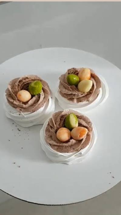 Автор видео: @cake_tabo ================================= ✅ Если Вам понравилось наше видео и рецепт, будем очень рады, если Вы подпишетесь на наш канал, поставите 👍 и оставите комментарий для обратной связи, большое вам спасибо ❤️ ================================= Слово автора: Хотите приготовить что-то вкусненькое на праздник, не потратив много времени? Тогда этот урок по приготовлению воздушного десерта Павлова то, что вы ищите. ⠀ ⭐Швейцарская меренга 100гр белок 200гр сахара Белок прогреть на водяной бане до 50-55С, время от времени помешивая и приподнимая дежу для высвобождения пара. Взбивать около 10-15 минут на средней скорости, 5-6 из 10. Дежа должна быть комнатной температуры или чуть теплее. Готовую массу переложить в мешок с насадкой 1М, отсадить гнезда диаметром около 8-10см. Сушить в духовке с конвекций при 75-80С около 120 минут. ⠀ ⭐Шоколадный крем 200гр творожного сыра 50гр сливок 50гр сахарной пудры 35-40гр молочного или темного шоколада 2 ст.л. какао Exstra Brut В деже взбить сыр, пудру, сливки, какао и 10гр шоколада. Взбить до плотной консистенции. Переложить в кондитерский мешок с насадкой 1М. ⠀ ⭐Яйца из пластичного шоколада (готовить заранее!!!) 100гр белого шоколада 50гр мед или глюкозный сироп Шоколад растопить, сироп прогреть до 35С. Ввести сироп в шоколад, вымешать, собрать в ком и упаковать в пищевую пленку. Оставить на 6-8 часов в холодильнике. Окрасить кусочки шоколадной массы в разные цвета жирорастворимым красителем. Из готовой массы слепить небольшие яйца, смешивая между собой цвета. ⠀ ⭐Сборка Крем отсадить на готовую меренгу в виде гнезда. Сверху посыпать оставшейся шоколадной крошкой. Украсить готовые гнезда шоколадными яйцами. По желанию можно сделать крапинки, смешав диоксид титана с небольшим количеством растительного масла. С помощью кисти и пальца нанести краситель на яйца. =========================================================