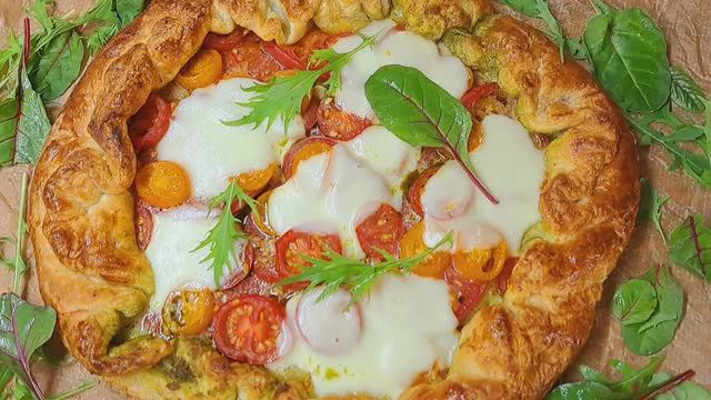 Нам понадобится: 1. Слоёное тесто 2. Соус песто 3. Разные помидоры (крупные 3, 4 шт., черри) 4. Моцарелла 5. Зелень для украшения