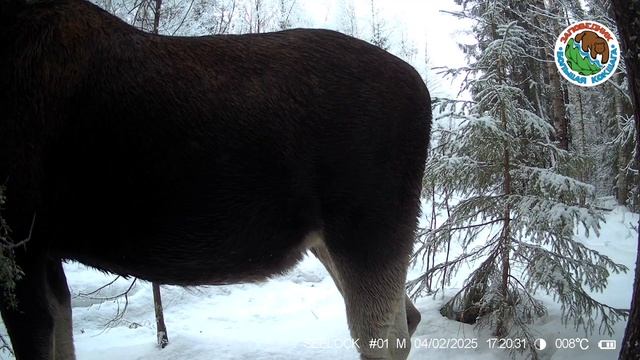 04.02.2025.Лось.Заповедник Большая Кокшага.Лосиха вышла из леса на дорогу. Долго есть молодые еловые
