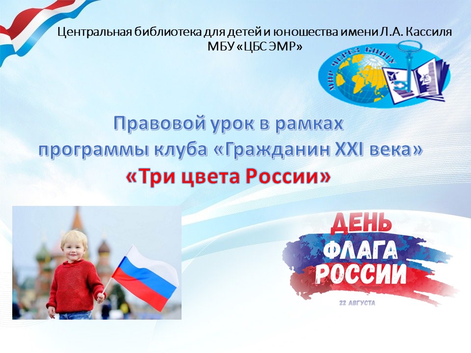Сотрудником Центра правовой информации Центральной библиотеки для детей и юношества им. Л.А. Кассиля в рамках программы клуба «Гражданин XXI века» подготовлен правовой видеоурок «Три цвета России», посвященный Дню флага Российской Федерации.