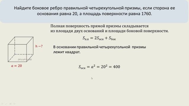 Найдите боковое ребро правильной четырехугольной призмы, если сторона ее основания равна 20, а площадь поверхности равна 1760.