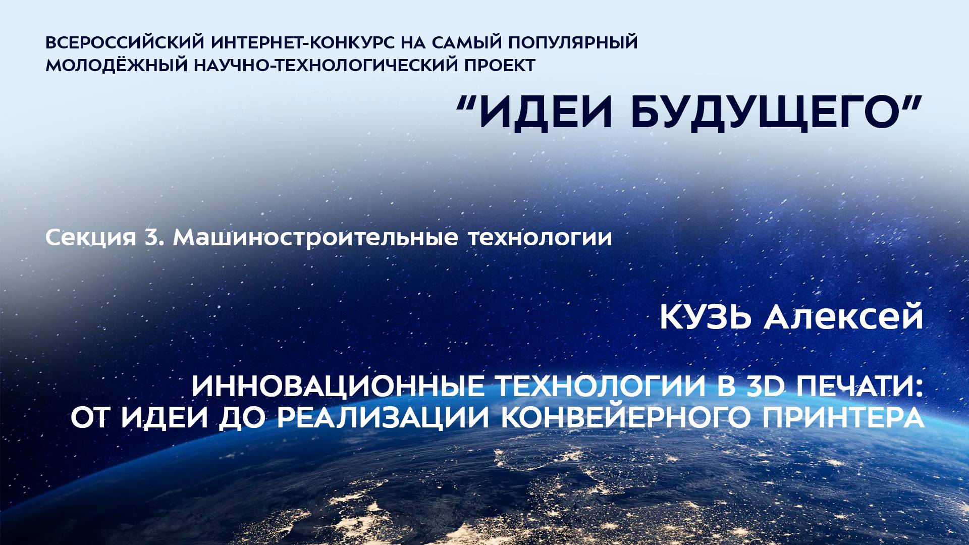 (3-4) КУЗЬ Алексей Николаевич Мурманская область, г. Мурманск Филиал НВМУ в г. Мурманске, 10 класс ИННОВАЦИОННЫЕ ТЕХНОЛОГИИ В 3D ПЕЧАТИ: ОТ ИДЕИ ДО РЕАЛИЗАЦИИ КОНВЕЙЕРНОГО ПРИНТЕРА Научные руководители: Хряпин Александр Васильевич, Мурманская область, г. Мурманск, Филиал НВМУ в г. Мурманске, преподаватель од (искусство, мхк и технология), Игицкий Евгений Викторович, Мурманская область, г. Мурманск, Филиал НВМУ в г. Мурманске, методист учебного отдела Более подробно о мероприятиях Программы "Шаг в будущее" можно узнать на сайтах http://www.step-into-the-future.ru/ и http://шагвбудущее.рф Мероприятия проводятся при поддержке Фонда президентских грантов