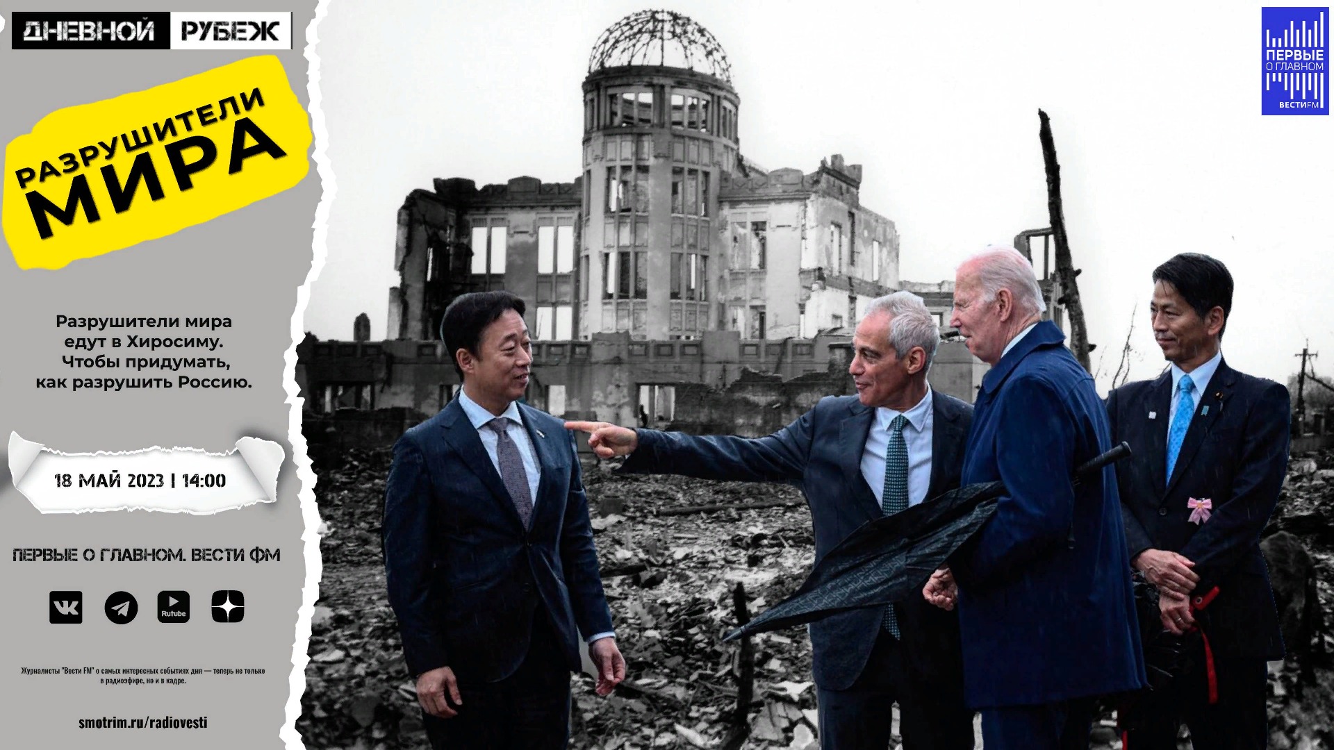 #дневнойрубеж #первыеоглавном #сво #донбасс #спецоперация #украина #крым #аксенов #диверсия #саммит #хиросима #байден #япония #g7 #афганистан #ассанж #пропаганда #сирия #алеппо #лавров #труман #опрос Разрушители мира едут в Хиросиму. Чтобы придумать, как разрушить Россию. ?Подписывайтесь на Telegram канал - Первые о главном: https://t.me/vestifmfirst ?Подписывайтесь на Rutube канал - Первые о главном: https://rutube.ru/channel/24115140/ ?Подписывайтесь на VK канал - Первые о главном: https://vk.com/first.vestifm ?Подписывайтесь на ДЗЕН канал - Первые о главном: https://zen.yandex.ru/id/5fc4960a799d1b24b5be5189 ?Подписывайтесь на Telegram канал - ВестиFM+: https://t.me/s/vestifmplus СМОТРИТЕ НАС НА ПЛОЩАДКЕ СМОТРИМ: https://smotrim.ru/channel/365