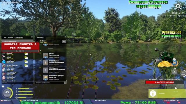 Поддержка донатом https://new.donatepay.ru/@1032463 Альтернативный донат https://www.donationalerts.com/r/kalyamba11 5536913964533059 карта Тинькоф Если стрим лагает,смотри стрим на трово https://trovo.live/s/Kalyamba_na_Ribalke Тг https://t.me/kalyamba_na_ribalke Мой ВК - https://vk.com/kalyantv НИК в игре kalyan11 НАШ ДС https://discord.gg/4ZzSQkQtsK Заказ водоема на 1 час - 500р ( весь стрим 2500р ) Модерка на канале 1300р ( каждая следующая на 100р больше) ✅Призы в рулетке "ЗОЛОТАЯ" 500р ✔ ЗОЛОТО ✔ ПРЕМ ✔ КАТУШКИ РАПТОР 40, ВЕНГИ, ТАЙГА, СИЛЬВЕР 80, И другие ✔ ПАЛКИ ПИЛКЕРНАЯ, ДОНКА МОРСКИЕ, ✔ РОД ПОД, СТУЛЬЯ ✅Призы в рулетке СТАНДАРТ : 100р ✔ катушкИ РАПТОР 40, ВЕНГИ, ТАЙГА, СИЛЬВЕР 80, И другие ✔ катушки 60 для медного ( ЭВИИ, НАТОРЫ, ГОЛДА, и тд) ✔ ПИЛКЕРНОЕ УДИЛИЩЕ КОРОЛЕВА ОКЕАНА ✔ Морское Донное удилище ✔ прем ( 3, 7, 30 дней) ✔ золото ( 1, 3, 5, 10, 20 ,50) ✔ билет на море ( 1, 3, 5 дней) ✔ голд наживка и др. ✅Призы в рулетке "СТАРТОВАЯ" 50р ✔ катушка Венга ✔ катушка "silver80" ✔ катушка "БЕЛЫЙ КАЛИБР" ✔ катушка "Черный калибр" ✔ катушка "Протон" ✔ катушка "Нарга 6000" ✔ Набор Фидерист и спинингист ✔ Карповик Фортуна ✔ фидерные удилища ✔ прем, золото, алкашка, наживки и тд P.s Рулетка это не казино, а награда за поддержку стримера. Вечный ТОП ПОДДЕРЖКИ (10.06.2025) 1. Леха сварной 214 572 2. Dimon_pokemonchik 127 034 3. Skreb79 103 061 4. Interceptor 96 230 5. FishRus86 82 500
