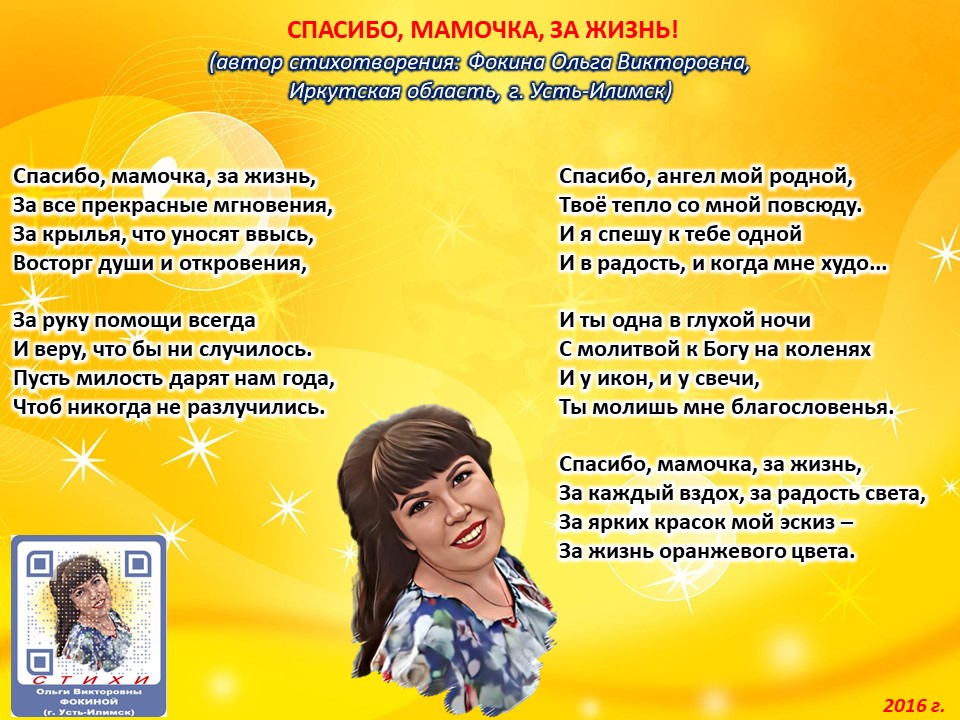 Читает автор стихотворения: ФОКИНА ОЛЬГА ВИКТОРОВНА (Иркутская область, город Усть-Илимск) СТИХИ: https://stihi.ru/2018/07/08/3790 БИОГРАФИЯ: http://www.proza.ru/2019/10/08/1473 ВЫИГРЫВАЙТЕ КНИГИ БЕСПЛАТНО: https://proza.ru/2017/09/17/447 ОТЗЫВЫ ЧИТАТЕЛЕЙ: http://www.proza.ru/2019/11/29/611 Из книги Фокиной Ольги Викторовны (Усть-Илимск) «Несу добро в ладошках!»: [все стихотворения с 2005 по октябрь 2020 гг., проза, авторские песни, интервью]. – Москва: МГО Союза писателей России, 2020 г. – 886 стр., ил. ISBN 978-5-7949-0826-8 СПАСИБО, МАМОЧКА, ЗА ЖИЗНЬ! (автор стихотворения: Фокина Ольга Викторовна, Иркутская область, г. Усть-Илимск) Спасибо, мамочка, за жизнь, За все прекрасные мгновения, За крылья, что уносят ввысь, Восторг души и откровения, За руку помощи всегда И веру, что бы ни случилось. Пусть милость дарят нам года, Чтоб никогда не разлучились. Спасибо, ангел мой родной, Твоё тепло со мной повсюду. И я спешу к тебе одной И в радость, и когда мне худо... И ты одна в глухой ночи С молитвой к Богу на коленях И у икон, и у свечи, Ты молишь мне благословенья. Спасибо, мамочка, за жизнь, За каждый вздох, за радость света, За ярких красок мой эскиз – За жизнь оранжевого цвета. 13 марта 2016 г.
