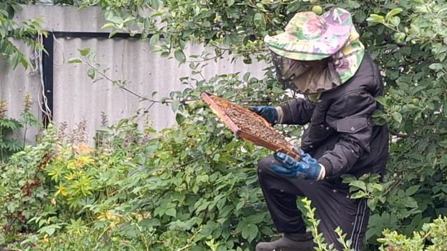 Рой пчёл сел на яблоню в саду.Сосед, мой двоюродный брат пчеловод стряхивает их на рамку.