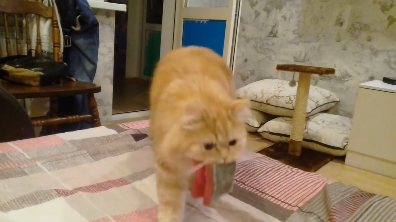 Кот рычит и бегает за губкой по команде апорт. #кот #злой #играет