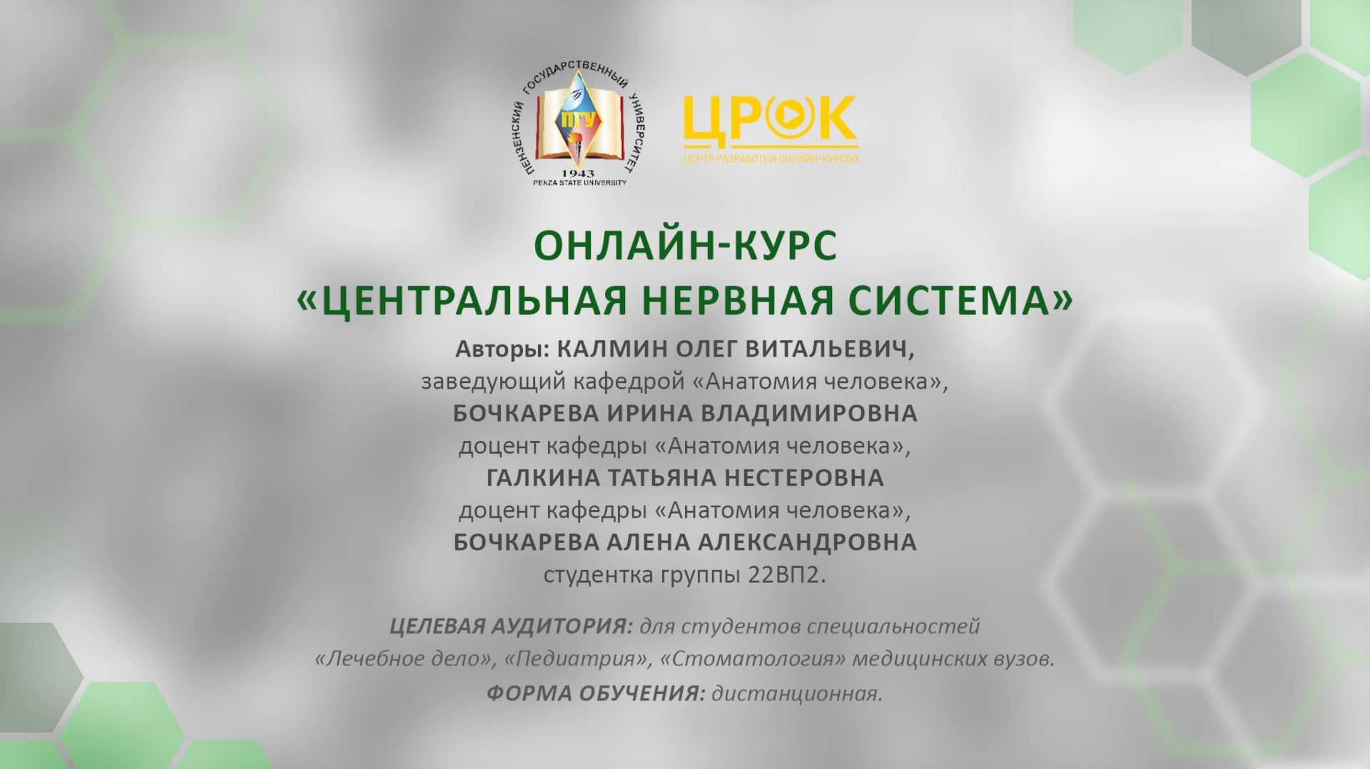 Авторы курса: Калмин Олег Витальевич, д.м.н., профессор, заведующий кафедрой "Анатомия человека" Бочкарева Ирина Владимировна, к.м.н., доцент кафедры "Анатомия человека" Галкина Татьяна Нестеровна, к.м.н., доцент кафедры "Анатомия человека" Медицинский институт Пензенский государственный университет