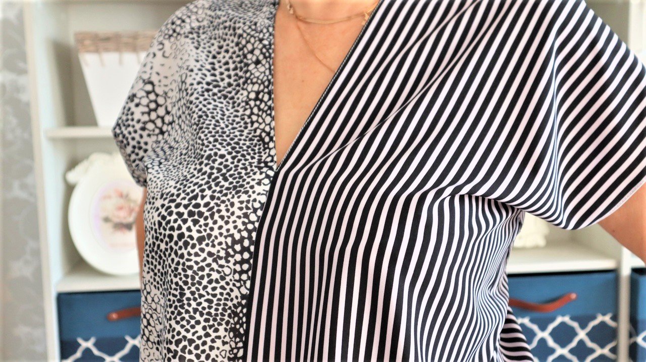 Сшила комбинированную блузку из двух одинаковых полос ткани. Для этого не нужна выкройка, надо померить только свой обхват груди.