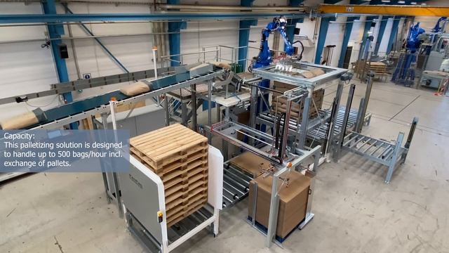 This video shows a fully automatic robot palletizing solution for 25 kg open mouth bags with milk powder. The solution is designed to handle up to 500 bags per hour incl exchange of pallets and will add great value to the customer as his packaging line is streamlined and made more efficient.