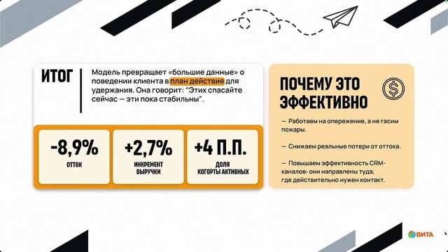 Сеть аптек «Вита» поделится 3 кейсами о том, как: — Распродать неликвид. ML-модель выявляет неходовой товар в каждой аптеке и клиентов, которым он будет интересен. — Предупредить отток. Алгоритм анализирует активность когорт и помогает вовремя удержать клиента персональным оффером. — Повысить ROI коммуникаций. Uplift-модель выявляет клиентов, которых рассылки действительно мотивируют к покупкам. 00:00 Начало 03:22 AI vs ML: разница для CRM 05:47 Барьеры внедрения ML-инструментов 08:24 Кейс №1: Стимуляция неликвидного ассортимента с помощью ML 13:36 Кейс №2: Работа с клиентами по жизненным циклам 20:05 Кейс №3: Практическое применение uplift-моделирования 23:23 Итоги внедрения моделей: +5% к выручке 25:20 Практические рекомендации по внедрению 30:43 Презентация и ресурсы для скачивания 32:28 Вопрос: Анализировали ли дальнейшее поведение возвращенных клиентов?