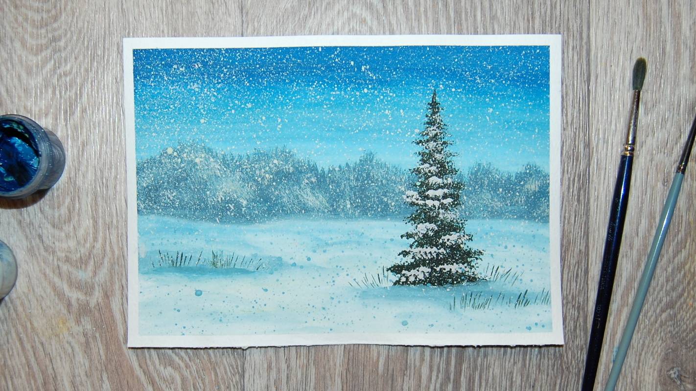 Как нарисовать ёлку гуашью. Зимний пейзаж