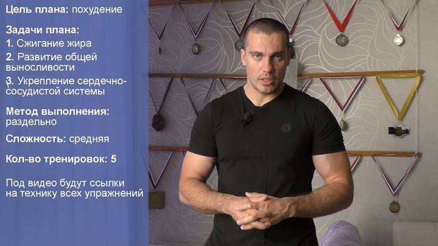 Тренировка 1: всё тело Разминка 5-10 мин https://www.youtube.com/watch?v=AqpyR6vQvj0 1. Приседания со штангой 3x12-20 https://www.youtube.com/watch?v=MhmjTfT_45U 2. Тяга за голову с верхнего блока 3x12-20 https://www.youtube.com/watch?v=3oGFh9Qodpg 3. Жим гантелями лёжа под углом вверх 3x12-20 https://www.youtube.com/watch?v=fB2oVB4XeI8 4. Пуловер с гантелей лёжа 3x12-20 https://www.youtube.com/watch?v=LJhN8d7ZAPQ 5. Гиперэкстензия 3x12-20 https://www.youtube.com/watch?v=b5xKWsrAjxM 6. Скручивания на тренажёре 3x12-20 https://www.youtube.com/watch?v=4wNi4keR_JE 7. Кардиотренажёр10-20 мин Заминка 2-5 мин https://www.youtube.com/watch?v=yM8WRIYeczA Тренировка 2: https://www.youtube.com/watch?v=PDRu_iaziUE Тренировка 3: https://www.youtube.com/watch?v=frf1_b-rw2g Тренировка 4: https://www.youtube.com/watch?v=NJQJlkbB8bM Тренировка 5: https://www.youtube.com/watch?v=NMz5Wt56YVU Подробнее об этом плане: https://tvoytrener.com/metodiki_obhcie/programma_pohudenie_5.php Скачать этот план: https://tvoytrener.com/dlia_pechati/programma_pohudenie_5.docx https://tvoytrener.com/dlia_pechati/programma_pohudenie_5.pdf Цель плана: похудение Задачи плана: 1. Сжигание жира 2. Развитие общей выносливости 3. Укрепление сердечно-сосудистой системы Методы выполнения: суперсеты Продолжительность: около 2-х месяцев. Сложность – средняя Как видно из названия, это фулбади тренировки. То есть на каждой тренировке вы будете нагружать всё тело. Будет по 6 упражнений. И в конце каждой тренировки – кардиотренажёр от 10 до 20 минут. Я советую использовать беговую дорожку или эллипс. Ну а вообще – что будет свободно. План я сделал несложным. И он вполне подойдёт для новичков, и для женщин, которые возвращаются к тренировкам после перерыва. Но если это ваши первые тренировки, то первую неделю сделайте все упражнения только по 2 рабочих подхода. Кстати, новичкам я всегда рекомендую начинать с планов, где не более 4-х тренировок в неделю. Поэтому, если 5 тренировок в неделю будет для вас слишком сложно, то вы можете один цикл делать не 7, а 9 – 10 дней. Так тоже можно. Например: ПН, СР, ПТ, ВС, ВТ. Отдых между подходами примерно 2 минуты. Можно чуть меньше или чуть больше (в зависимости от тяжести подхода и самого упражнения). Вместе с разминкой и заминкой каждая тренировка должна занимать от 60 до 80 минут. Если менее 60 – увеличивайте веса. Если более 80 – уменьшайте веса.
