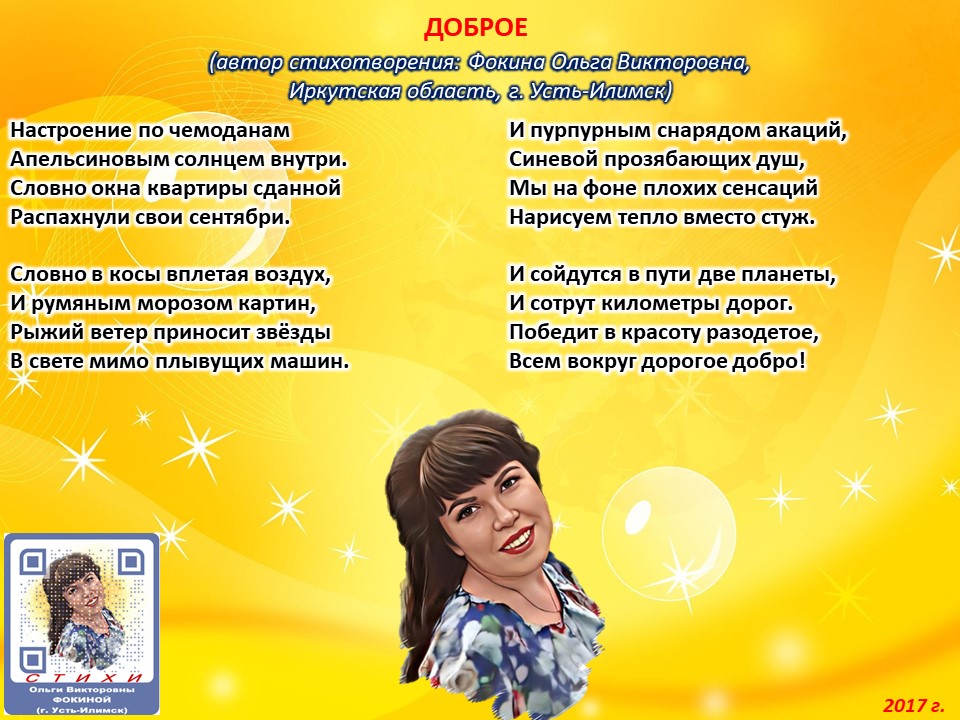 Читает автор стихотворения: ФОКИНА ОЛЬГА ВИКТОРОВНА (Иркутская область, город Усть-Илимск) СТИХИ: https://stihi.ru/2018/07/08/3790 БИОГРАФИЯ: http://www.proza.ru/2019/10/08/1473 ВЫИГРЫВАЙТЕ КНИГИ БЕСПЛАТНО: https://proza.ru/2017/09/17/447 ОТЗЫВЫ ЧИТАТЕЛЕЙ: http://www.proza.ru/2019/11/29/611 Из книги Фокиной Ольги Викторовны (Усть-Илимск) «Несу добро в ладошках!»: [все стихотворения с 2005 по октябрь 2020 гг., проза, авторские песни, интервью]. – Москва: МГО Союза писателей России, 2020 г. – 886 стр., ил. ISBN 978-5-7949-0826-8 ДОБРОЕ (автор стихотворения: Фокина Ольга Викторовна, Иркутская область, г. Усть-Илимск) Настроение по чемоданам Апельсиновым солнцем внутри. Словно окна квартиры сданной Распахнули свои сентябри. Словно в косы вплетая воздух, И румяным морозом картин, Рыжий ветер приносит звёзды В свете мимо плывущих машин. И пурпурным снарядом акаций, Синевой прозябающих душ, Мы на фоне плохих сенсаций Нарисуем тепло вместо стуж. И сойдутся в пути две планеты, И сотрут километры дорог. Победит в красоту разодетое, Всем вокруг дорогое добро! 13 июля 2017 г.