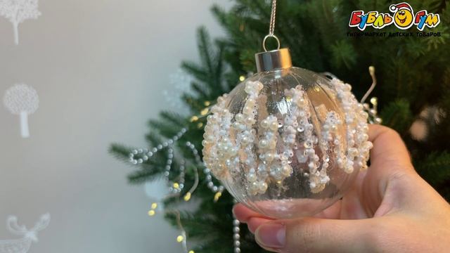 331630 Украшение елочное Шар с узором из белого бисера прозрачный стекло 8см