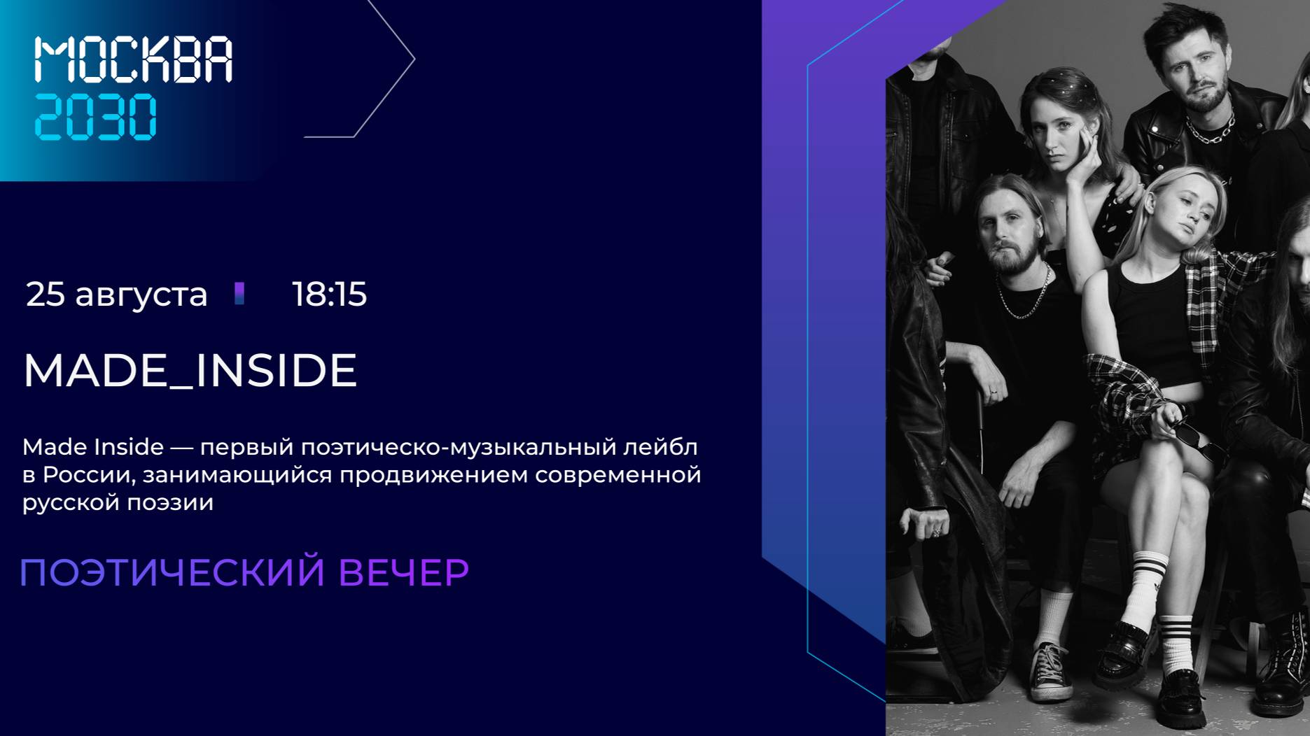Выступление артистов музыкально-поэтического лейбла Made Inside. Прозвучат стихи современных авторов об атмосфере огромного дышащего города, где каждый уголок наполнен жизнью. Погрузитесь в наблюдение за городом и его жизнью глазами наших поэтов-современников.