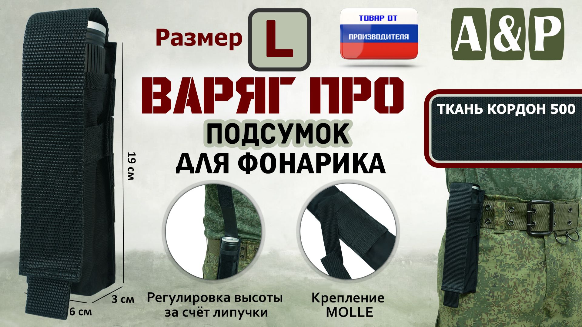 Заказать подсумок Варяг ПРО для фонарика, а также другие аксессуары можно на официальном сайте компании А&Р Групп: https://ap-group-llc.ru/ Возможность изготовления товаров по индивидуальным размерам и проектам. Гарантия на продукцию 1 год. Доставка осуществляется по всей России, а также в Казахстан и Беларусь. _______________________________________________________________________ Мы ВКонтакте: https://vk.com/apgroup Мы на Wildberries: https://www.wildberries.ru/seller/198927 Мы на Ozon: https://www.ozon.ru/brand/a-p-87358243/ Мы на Я.Маркете: https://market.yandex.ru/business--a-r-grupp-rossiiskii-proizvoditel-aksessuarov/864809