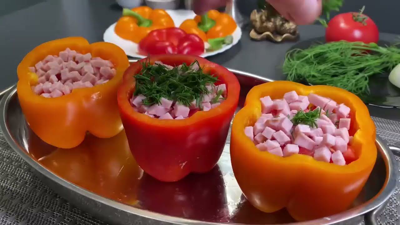 Фаршированный перец в духовке! Незабываемый вкус и простой домашний рецепт! Вкуснейшие фаршированные перцы, запеченные в духовке из простых ингредиентов! Всем советую попробовать это сочетание продуктов - безумно вкусно. ******************************************************* **** * Ингредиенты: - Паприка - 3 штуки (крупные) - 6 яиц - масло растительное 1 ст. - 1/2 луковицы - 1 помидор - 2 ломтика ветчины - Укроп - Соль, перец по вкусу - 60 грамм сыра Приятного аппетита!