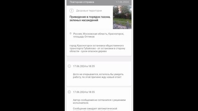 Ответ с сайта Добродел - сухое опасное дерево спилили, опять только после моего обращения. Сотрудники администрации города Красногорска получают зарплату за свою работу, а я делаю это абсолютно бесплатно. #2024 #россия #красногорск #ответ #отчет