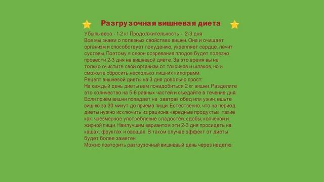Содержание видео: Разгрузочная вишнёвая диета \\\\\\\\\\\\\\\\\\\\\\\\\\\\\\\\\\\\\\\\\\\\\\\\\\\\\\\\\\\\\\\\\\\\\\\\ Похудение это начало новой жизни, если вы пришли к мысли что вам пора худеть, значит вы на правильной дороге. Похудеть это значит помочь своему организму. Похудеть это значит сделать свою жизнь радостней и прекрасней. Похудеть это значит забыть о своих недугах и стать прекрасной.Не забывайте, что похудение должно проходить разумно. Не нужно мучить свой организм безумными диетами и не подьёмными физическими занятиями. Разумные диеты и разумное занятие спортом. Вот залог вашего похудения. И не забываем и про силу воли которая поможет вам преодолеть все невзгоды в похудении. А невзгод будет очень много .Начиная от плохого настроения до желания всё бросить и пойти скушать вкусный тортик. Так что силы Вам побольше и похудеть вы сможете без проблем На нашем канале вы узнаете ответы на такие вопросы как - как похудеть,как правильно похудеть, как похудеть без диет, как похудеть сохранив здоровье, правильное питание, здоровый образ жизни, как похудеть и навсегда забыть про диеты, похудение без диет без фитнеса и без таблеток. Программа диеты на кашах: https://www.youtube.com/playlist?list=PLci693nd4zMO7B-bcq8lOoxg3l4JVPkqk -Программа диеты от звёзд: https://www.youtube.com/playlist?playnext=1&list=PLci693nd4zMMo6mTqmBUc1rKlg5bhmE_S -Программа диеты для похудения: https://www.youtube.com/playlist?playnext=1&list=PLci693nd4zMNaH1PAXuqmkJi7CF4E2qBH Программа авторские диеты: https://www.youtube.com/playlist?list=PLci693nd4zMPw7CKlzTwj8XY7kry8x4ca -Подпишитесь: https://www.youtube.com/channel/UCh0o9mjNvFjstJLE3H0amzA?sub_confirmation=1 Информация с сайта http://fotodiet.ru/ Бесплатный курс по YouTube от Конодена: http://superpartnerka.biz/shop/112 Академия YouTube от Конодена: http://superpartnerka.biz/shop/113 Каталог курсов от Евгения Попова: http://p.cscore.ru/s/19707