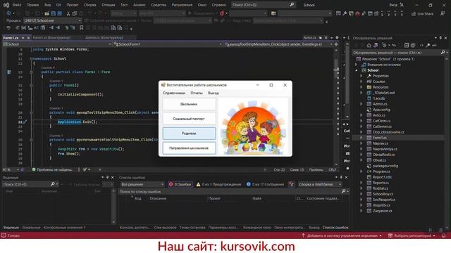 https://kursovik.com/programming/101450422.html Автоматизация воспитательной работы среди школьников. Курсовая работа. Среда разработки: Visual Studio. Среда программирования: Visual C# .NET 2019. База данных: Access. Программный продукт "Воспитание школьников" выполнен в C# WinForms + MS Access. Программа позволяет автоматизировать воспитательный процесс среди школьников. Пользователь системы после авторизации может обрабатывать справочную и оперативную информацию о школьниках. Полный перечень справочников представлен на скриншотах. Также для каждого школьника можно регистрировать перечень его родителей и родственников, с указанием всей сопутствующей информацией. Для каждого школьника есть возможность указать направления, которыми он занимается, а также сформировать социальный паспорт. На основании зарегистрированных данных можно просмотреть список учеников по различным критериям социального паспорта, построить диаграмму о вовлеченности учеников в мероприятия, а также сформировать отчет о занятости учеников. Приобрести исходники(все файлы проекта) данной программы Вы можете, заполнив следующую форму: https://kursovik.com/programming/101450422.html?camefrom=rutube#form Заказать отчёт(описание): https://kursovik.com/programming/101450422.html?camefrom=rutube#pz_need Заказать модификацию: https://kursovik.com/uniform.html?modify=101450422&camefrom=rutube Заказать новую программу: https://kursovik.com/programming_order.html?camefrom=rutube Задать вопрос автору: https://kursovik.com/programming/101450422.html?camefrom=rutube#vopros Наш Телеграм-БОТ для поиска готовых работ по программированию https://t.me/kursovikcom_bot , в нашей базе более 5и тысяч готовых работ, для более эффективного поиска используйте наш Телеграм-БОТ. Список наших готовых работ по программированию: https://kursovik.com/progtopic.html?camefrom=rutube Разработка программ на заказ согласно Вашему заданию: https://kursovik.com/programming_order.html?camefrom=rutube Мы пишем программы практически на всех языках программирования, работаем с различными базами данных, выполняем как мелкие задачки, так и крупные проекты. Разрабатываем и запускаем в работу ЧАТ-БОТы. Обращайтесь - всегда будем рады Вам помочь! Если нужно переписать данную программу на другой язык программирования - обращайтесь - сделаем. Адрес нашего сайта: https://kursovik.com Наши контакты: https://kursovik.com/contacts.html Наша группа ВК: https://vk.com/kursovik (всем подписчикам скидка 5%) Наш Телеграм-канал: https://t.me/kursovik (всем подписчикам скидка 5%) Наш Дзен-канал: https://dzen.ru/kursovik (всем подписчикам скидка 5%) Наш RuTube-канал: https://rutube.ru/channel/41864889 (всем подписчикам скидка 5%) Наш YouTube-канал: https://youtube.com/@kursovik_com (всем подписчикам скидка 5%) (скидки не суммируются :-) #курсоваяработа #базыданных #visualstudio #программирование