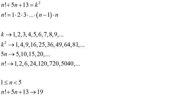 Найти решение в нутарульных числах n!+5n+13=k^2