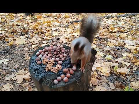 Белка прикрывает листьями спрятанные орехи