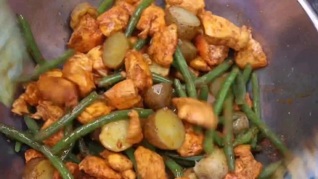 4 skinless chicken breast cubed 2 cups, green beans 4 cups, small potatoes 2 tbsps, Cajun seasoning 2 Tsp garlic powder 2 Tsp onion powder 1 Sazon packet 1 tbsps grape seed oil or olive oil 5 tsps butter ( I use vegan butter) Cajun gravy sauce: 2 1/4 cups, chicken broth (sub: water) 3 Tbsps, all-purpose flour 2 Tbsps oil 2 Tbsps butter 1/3 cup, yellow onions-diced 1 Tbsp Cajun seasoning 1 tsp Sazón seasoning 1 tsp onion powder 2 tsps garlic powder Salt and pepper to taste Add seasoning to your liking