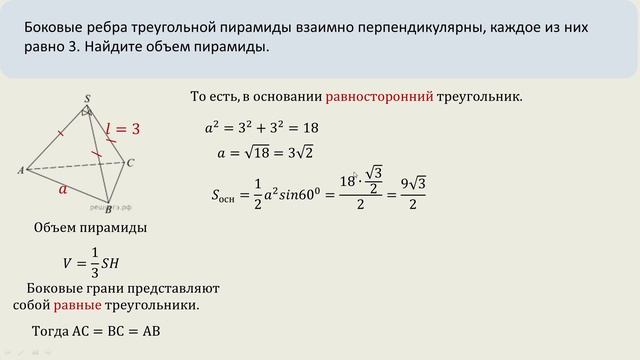 Боковые ребра треугольной пирамиды взаимно перпендикулярны каждое из них равно 3.
