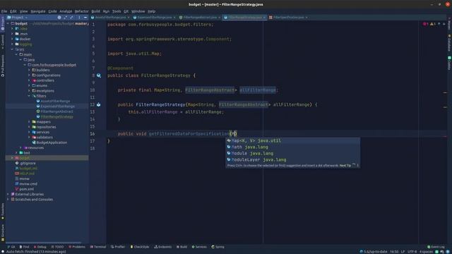 00:00 Wprowadzenie 01:24 Aktualizacja Enuma FilterSpecification 02:00 Dodanie Klasy FilterRangeStrategy 02:15 Aktualizacja klas zakresów filtrów 02:41 Aktualizacja FilterRangeStrategy 03:26 Aktualizacja metody getAllByFilter o parametr 03:43 Aktualizacja Serwisów - dodanie strategii 04:07 Usunięcie if'ów z metody getAllByFilter 04:26 Aktualizacja testów 05:18 Czyszczenie FilterRangeAbstract repozytorium kursu: git clone https://github.com/robertszczygielski/budget.git IntelliJ - poradnik - tworzenie branchy z historii Gita https://youtu.be/_NyRY6b0rpY