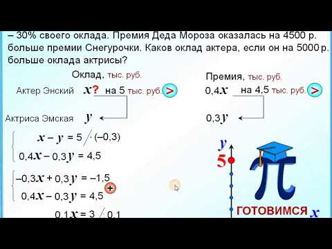 7 класс. Система линейных уравнений. Актер Энский за роль Деда Мороза получил премию равную 40% своего оклада, а актриса Эмская, за роль Снегурочки – 30% своего оклада. Премия Деда Мороза оказалась на 4500 р. больше премии Снегурочки. Каков оклад актера, если он на 5000 р. больше оклада актрисы?