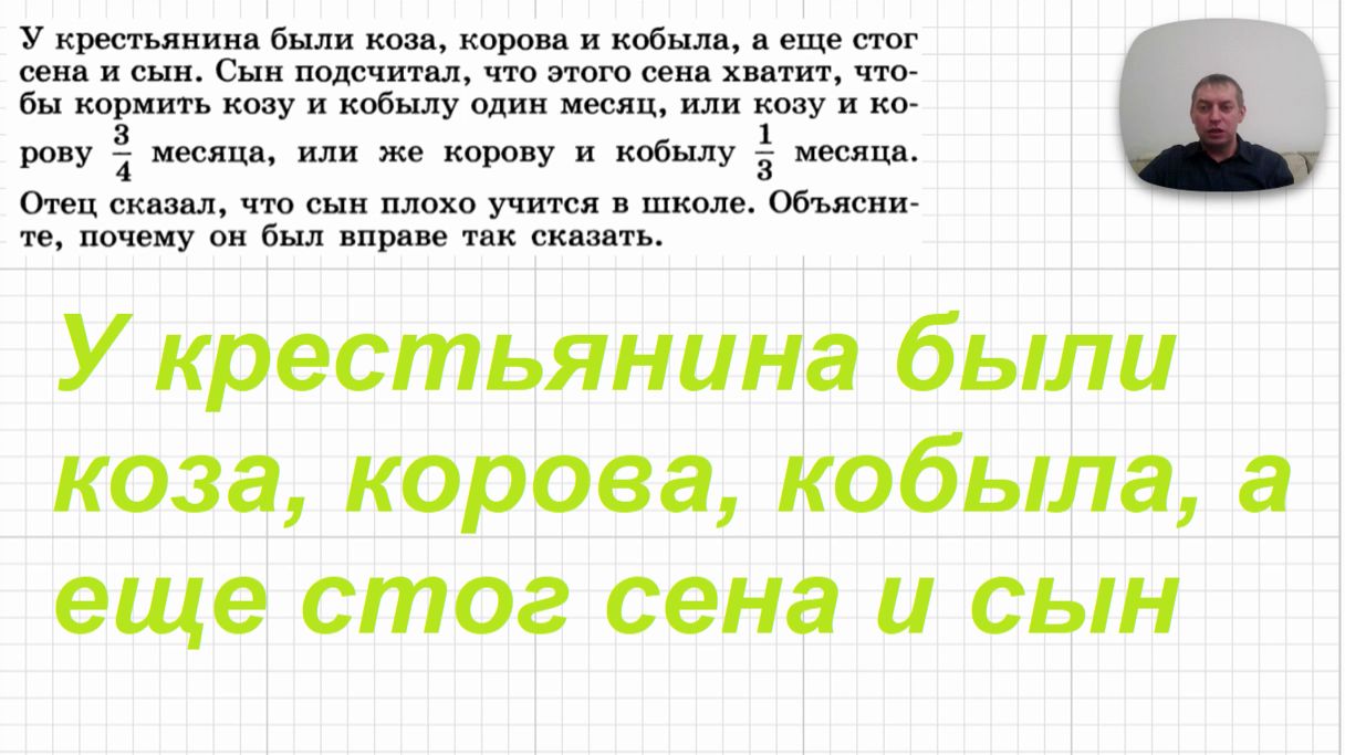 День 32-й. Во-первых, всех поздравляю с наступившим 2026-м годом! Ну а сегодняшняя задачка будет довольно простой, можно сказать, обычной школьной для учеников 6-7 класса, но условие в ней весёлое, наверное, она многих заставит хотя бы слегка улыбнуться в это не простое новогоднее то ли утро, то ли день, то ли... Ну у кого как ;) Для понимания решения нужно протереть глаза, иметь немножко логики и желательно знания на уровне 7 класса средней общеобразовательной школы, потому что придется составлять систему уравнений. )