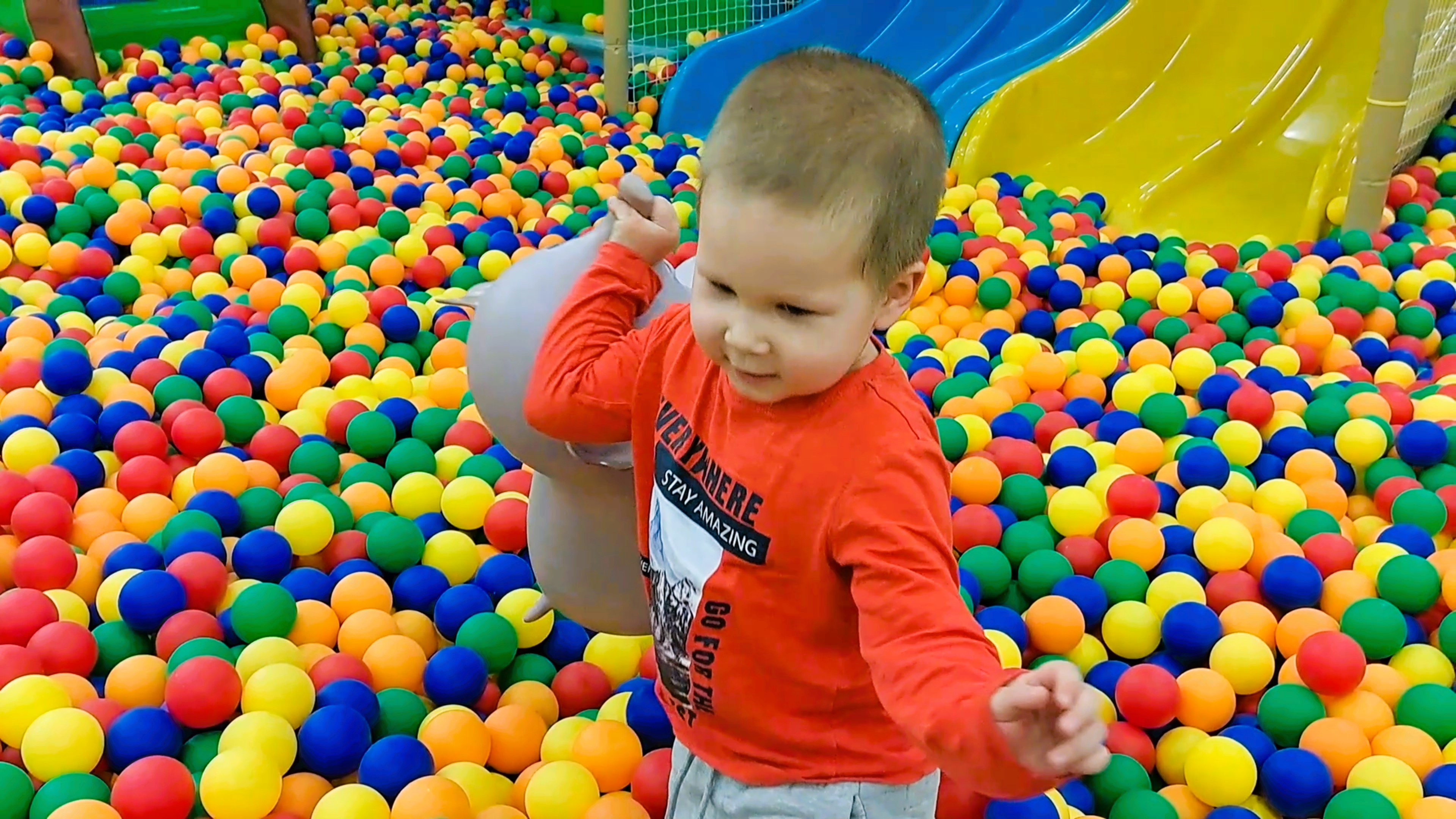 Ребенок играет на детской площадке со слоником и прыгает на батуте