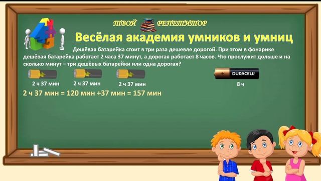Дешёвая батарейка стоит в три раза дешевле дорогой. При этом в фонарике дешёвая батарейка работает 2 часа 37 минут, а дорогая работает 8 часов. Что прослужит дольше и на сколько минут – три дешёвых батарейки или одна дорогая? 📌 Запись на индивидуальные занятия по предметам МАТЕМАТИКА, РУССКИЙ ЯЗЫК, ВПР, МЦКО с 1 по 4 класс: https://vk.com/gim213583492 ✓ Понравилось? Подпишись!