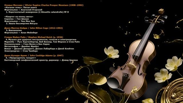 В данном собрании представлены произведения следующих композиторов: Оливье Мессиан, Джон Милтон Кейдж, Стивен Майкл Райх, Джон Кулидж Адамс.